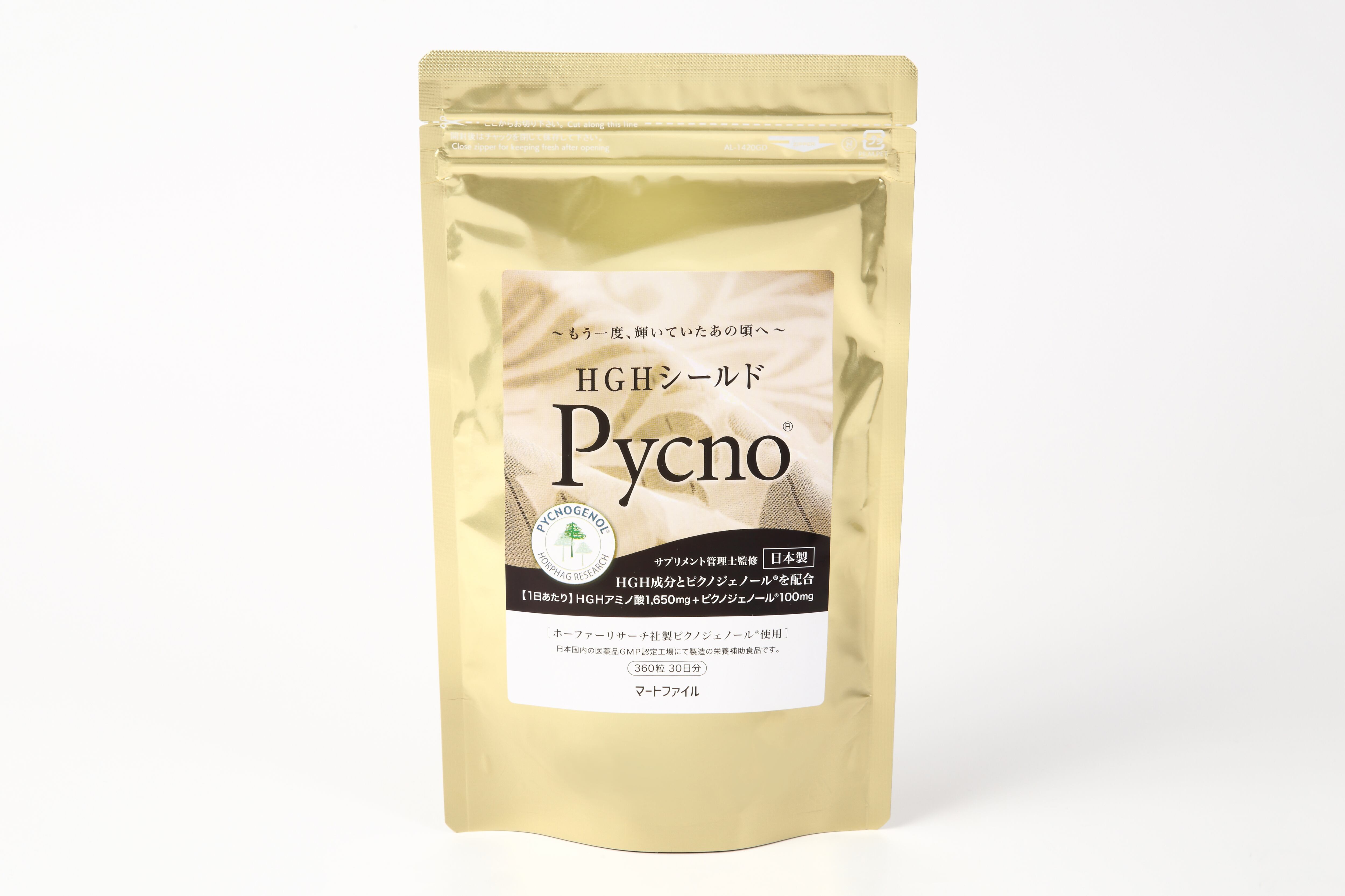 HGHシールドPycno®には、10年以上の独自の研究配合に基づく リジン、オルニチンなどの「HGHアミノ酸」、ホーファーリサーチ社製のフランス産「ピクノジェノール®」をはじめとした年齢に悩む方にお勧めのサプリメントです。